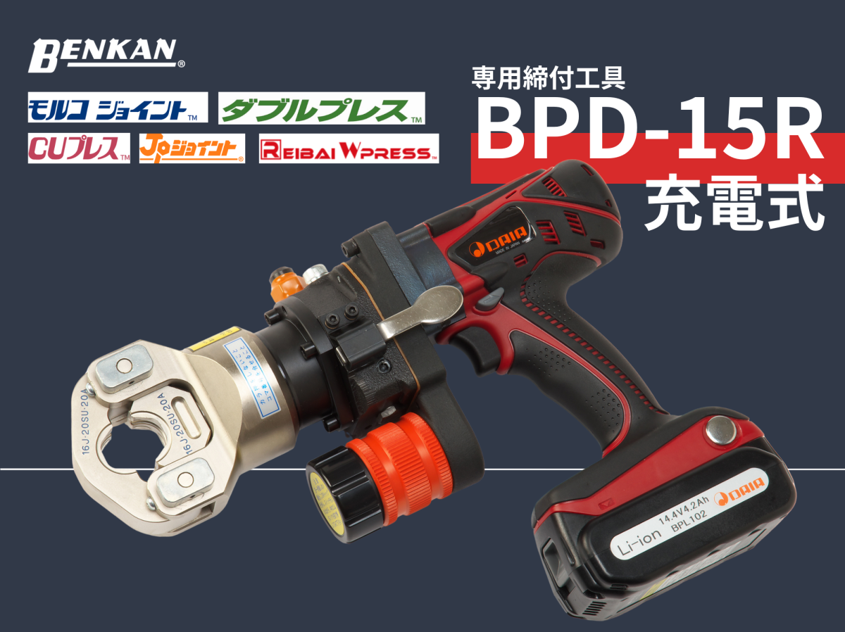 「BPD-15R」(製造元:株式会社ダイア)は、ベンカン製プレス式継手すべてに対応可能な専用締付工具であり、BPDシリーズの中でも特にご好評をいただいている充電式タイプの機種です。